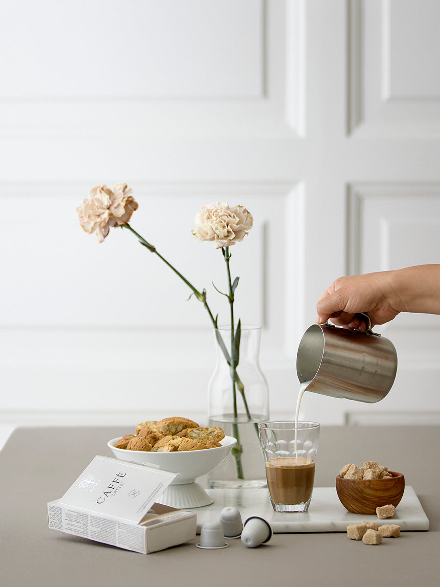 Vores bæredygtige kaffekapsler er lavet af majsstivelse og sukkerrør, og produceret med ren sol-, vind- og vandenergi. Indeni gemmer der sig vores egen fyldige Latte – en dyb og karakterfuld kaffe, skabt til dig, der elsker en smagsfuld kaffedrik med mælke.