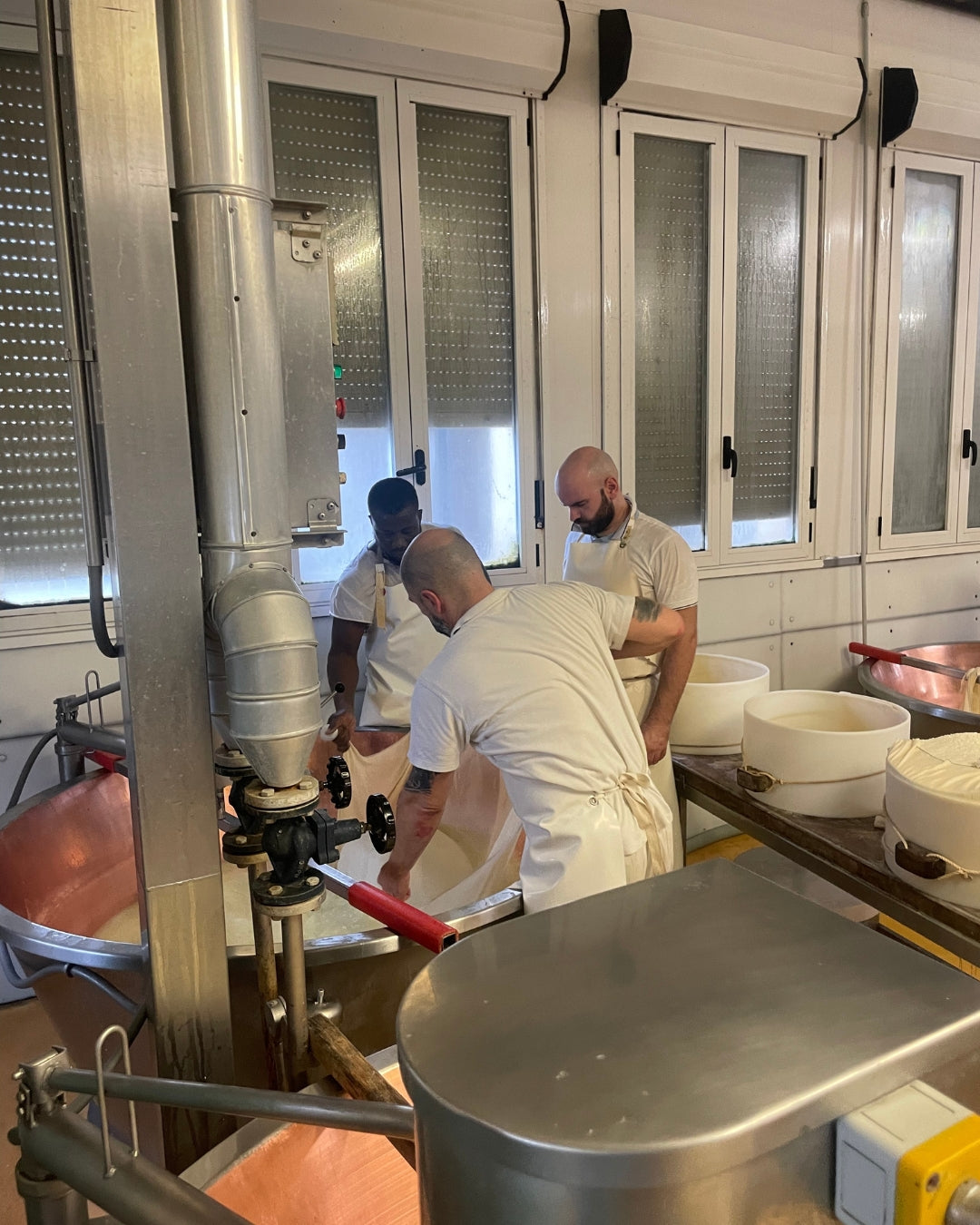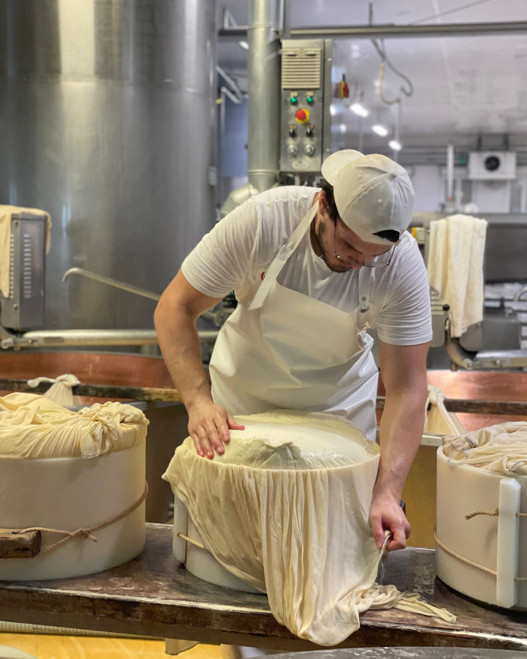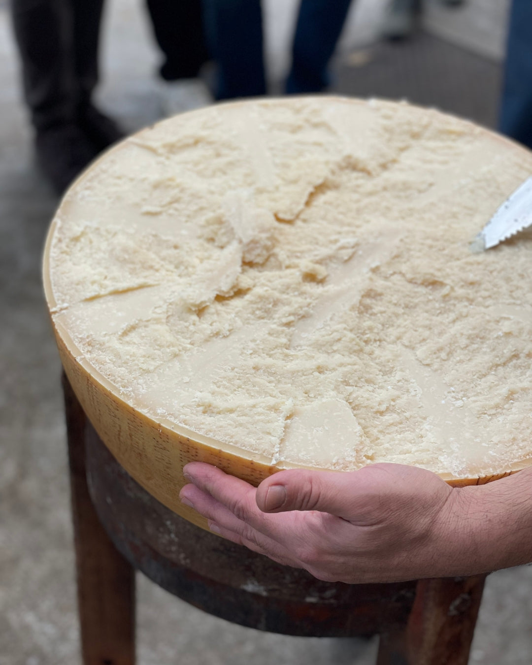 Parmesanen brydes i rustikke stykker på ca. 400 g – hver ost kontrolleres, vendes og børstes manuelt hver uge for at sikre den rette kvalitet.